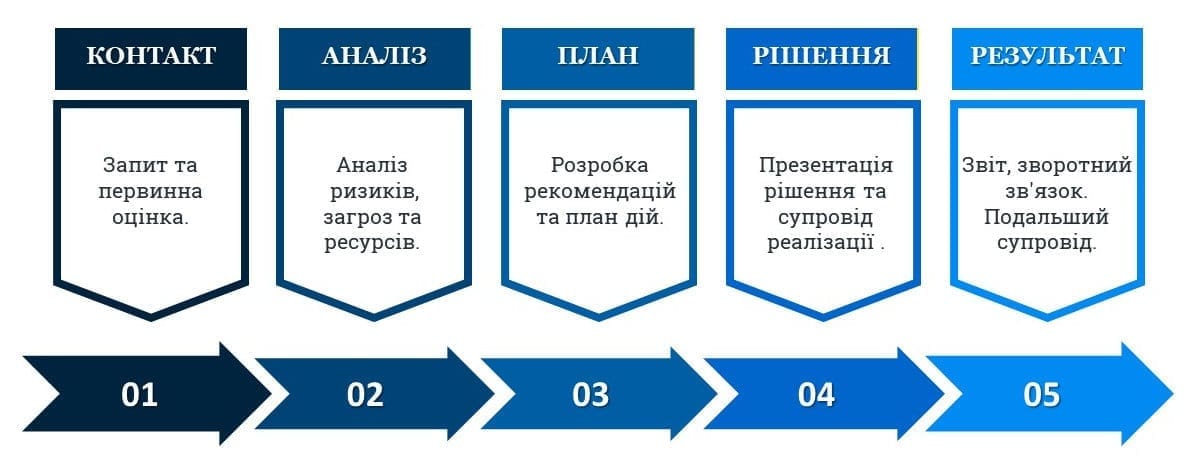 Наша команда спеціалізується на аналізі, розробці та впровадженні стратегій та програм у сфері фізичної безпеки. Ми надаємо професійні послуги аудиту та консалтингу для державних структур, корпоративних клієнтів, сімейних офісів, підприємств та топ-менеджерів.