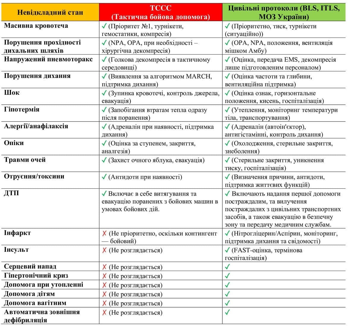 Порівняємо перелік невідкладних станів, що охоплюються TCCC, та ті, що актуальні для цивільних протоколів: